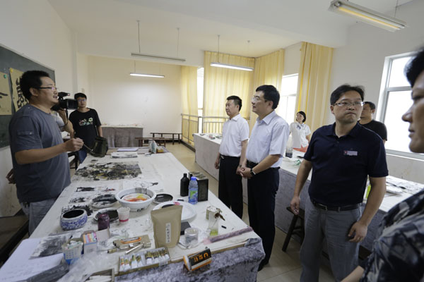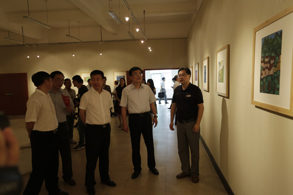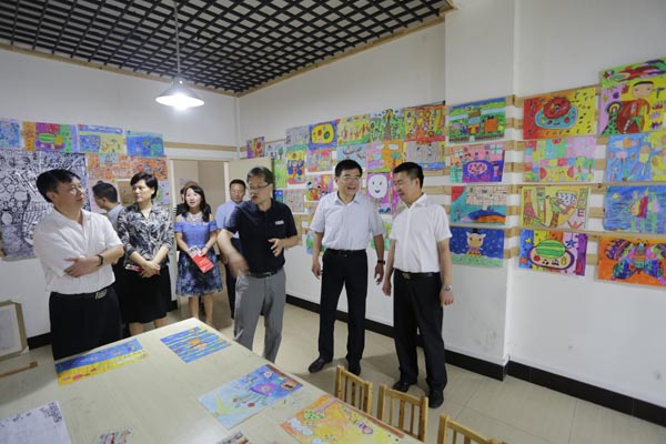 梁桂部長詳細(xì)地參觀了非遺陳列館、非遺傳習(xí)所、公益藝術(shù)培訓(xùn)中心、少兒美術(shù)培訓(xùn)中心等免費(fèi)開放場地。與傳承人及社團(tuán)骨干親切交談,詢問了文藝社團(tuán)骨干的日常排練和下基層演出等情況。他指出文化惠民是黨和政府近幾年親民、愛民政策的體現(xiàn),希望他們多編排具有地方特色群眾喜愛的節(jié)目,到基層把黨的文化惠民和溫暖傳遞到偏遠(yuǎn)的農(nóng)村去。觀看了“美麗中國我的家·全國少兒美術(shù)大賽”優(yōu)秀作品展,并翻閱了《美麗中國我的家兒童畫集》,當(dāng)他得知這一品牌活動已連續(xù)開展了七年時,梁部長指出少年兒童是中國的未來,要多為青少年搭建和展示藝術(shù)才華的平臺。