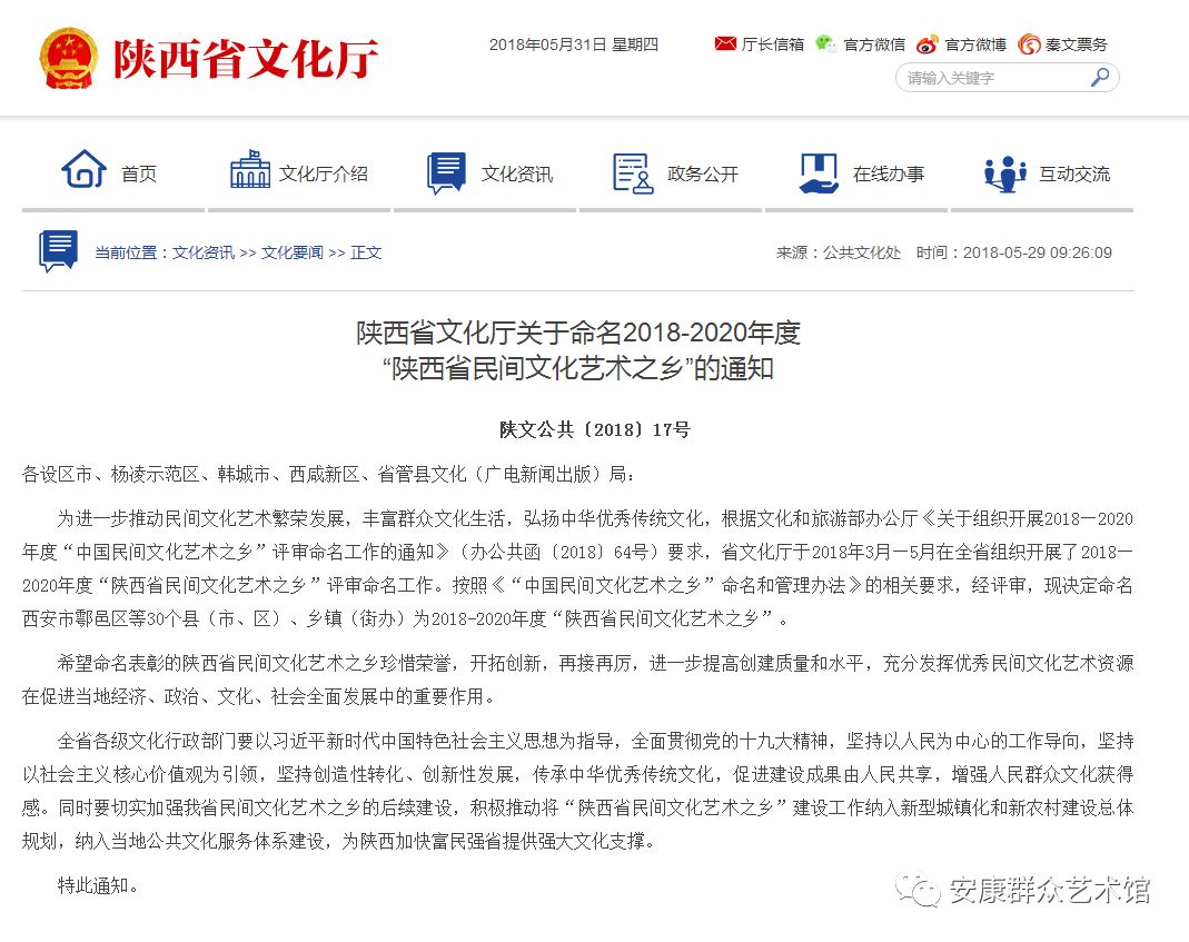 5月28日,陜西省文化廳正式公布“陜西省民間文化藝術(shù)之鄉(xiāng)”評審命名結(jié)果(陜文公共【2018】17號),我市紫陽縣、旬陽縣被省文化廳授予“陜西省民間文化藝術(shù)之鄉(xiāng)”稱號。