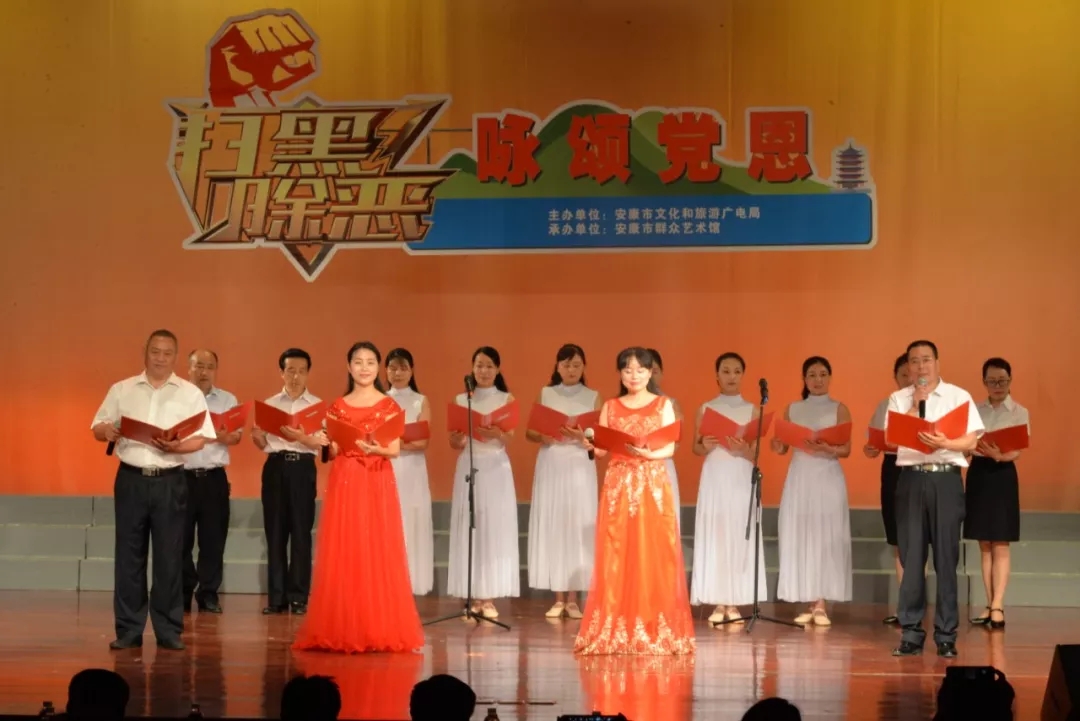 晚會在大合唱《掃黑除惡安康在行動》雄壯、鏗鏘的旋律中拉開帷幕。