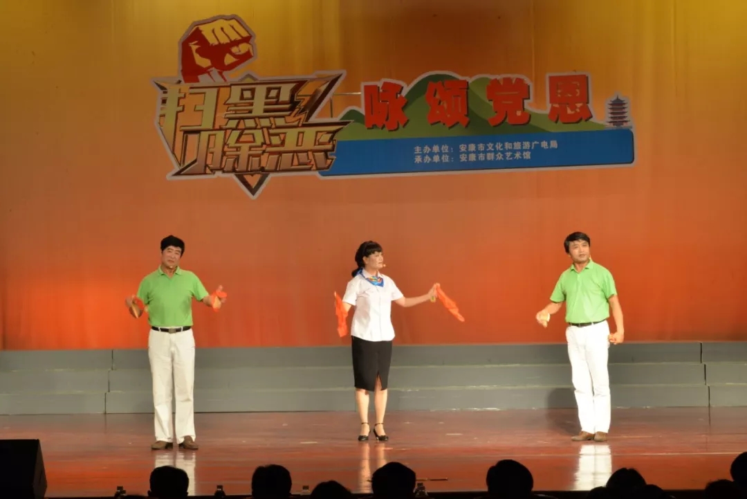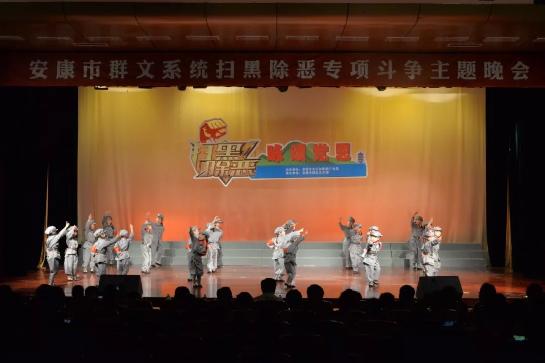2019年6月25日晚上19:30,由安康市文化和旅游廣電局主辦,安康市群眾藝術(shù)館承辦,安康市曲藝家協(xié)會、安康南楓民間歌舞團、安康博閱學(xué)社、安康水電總廠“舞之戀”藝術(shù)團等單位協(xié)辦的市直群文系統(tǒng)“掃黑除惡專項斗爭”主題晚會又在安康市群眾藝術(shù)館劇場隆重上演,這也是安康中心城區(qū)2019年第一場以“掃黑除惡”為主題的專題晚會。安康市文化和旅游廣電局黨組書記、局長楊海波,安康市紀(jì)委常委、安康市監(jiān)委委員、市委巡查組組長方賢超,安康市委政法委副書記、市掃黑辦副主任朱定新,安康市法學(xué)會專職副會長、市掃黑辦副主任謝賢梅,市掃黑辦副主任曹修斌;安康市文化和旅游廣電局副局長王軍,安康市文化和旅游廣電局副局長劉璇,安康市群眾藝術(shù)館館長周墻等相關(guān)部門領(lǐng)導(dǎo)出席晚會并和數(shù)百位社會各界群眾一起觀看了演出。