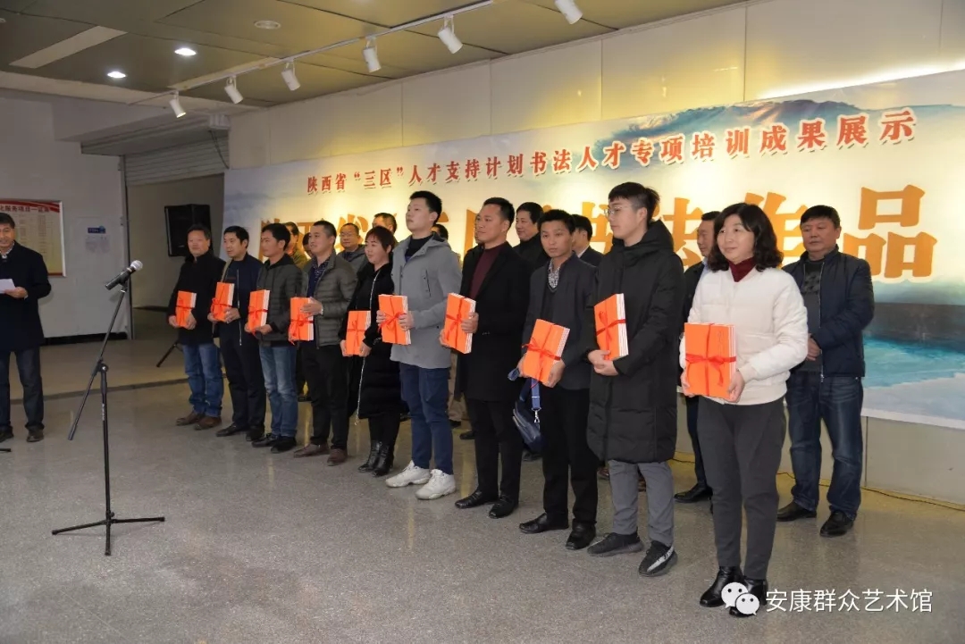 此外,在開(kāi)幕式上還為十縣區(qū)文化館代表捐贈(zèng)"三區(qū)"項(xiàng)目成果書(shū)法作品集。最后,由安康市委宣傳部副部長(zhǎng)、市文聯(lián)黨委書(shū)記李康林宣布展出正式開(kāi)始。